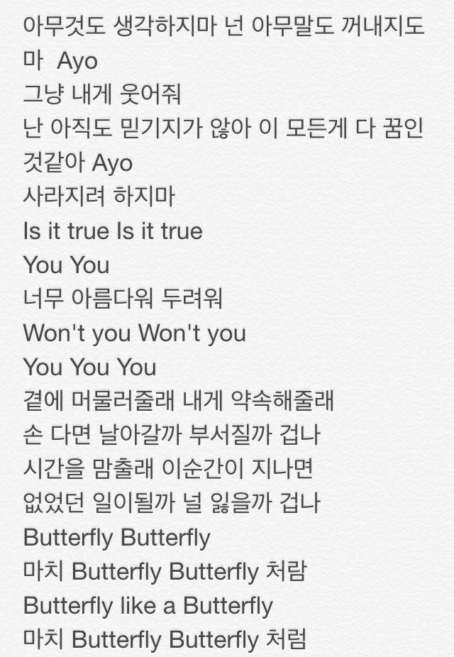 Ayoo.just keep smiling at me, yeah i still can't believe it with my own eyes. *this is the part that is crucial to my interpretation. Jungkook] 아무것도 생각하지 마 넌 아무 말도 꺼내지도 마 그냥 내게 웃어줘. Please don't think of anyone but me… please just don't say a thing. Bts' 'butterfly' explores the fear of losing someone: